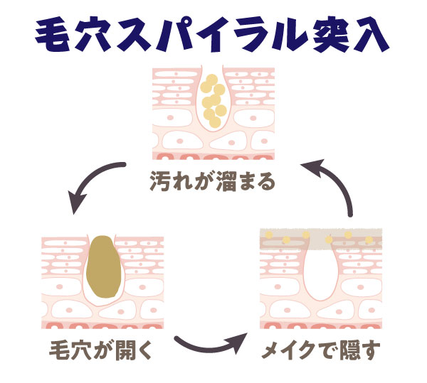 毛穴にどんどんメイク汚れが溜まっていき、もっと毛穴が開いてしまいます。